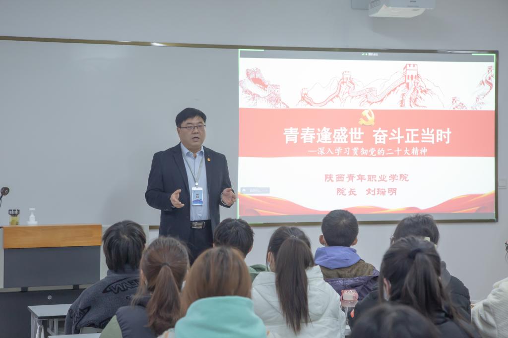 刘瑞明以《青春逢盛世奋斗正当时——深入学习贯彻党的二十大精神》为题,带领同学们全面回顾了党的二十大主要内容,深刻阐明党的二十大重要意义,通过一组组数据生动展示了党和国家过去五年取得的辉煌成就和新时代十年的伟大变革,并结合小学教育专业优秀毕业生的鲜活案例和学生成长成才的具体实际,以党的二十大报告中“实施科教兴国战略,强化现代化建设人才支撑”为切入点,分析了当前高等职业教育的形势与任务,勉励同学们要立志做有理想、敢担当、能吃苦、肯奋斗的新时代好青年,努力成长为党和人民满意的“四有”好老师。