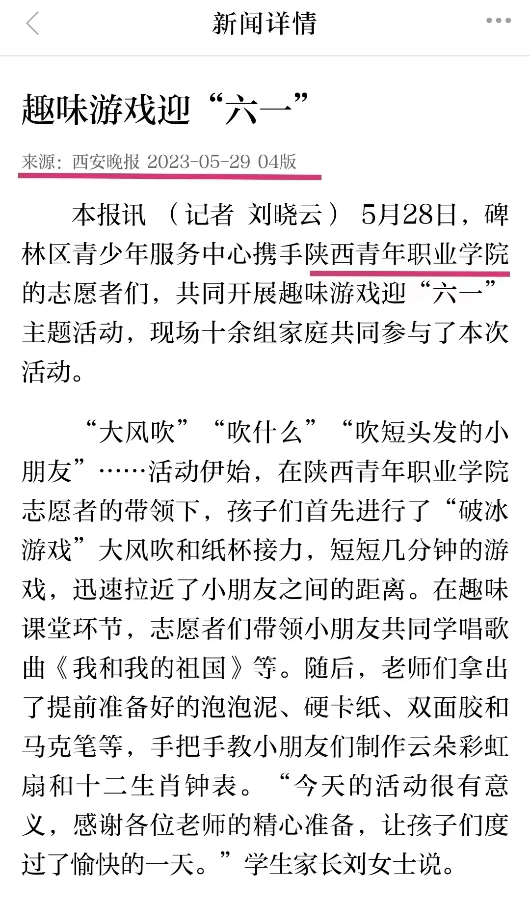 5月28日,学前教育系组织志愿者团队赴西安市碑林区青少年服务中心开展爱心公益活动,受到了西安晚报等媒体的关注和报道。