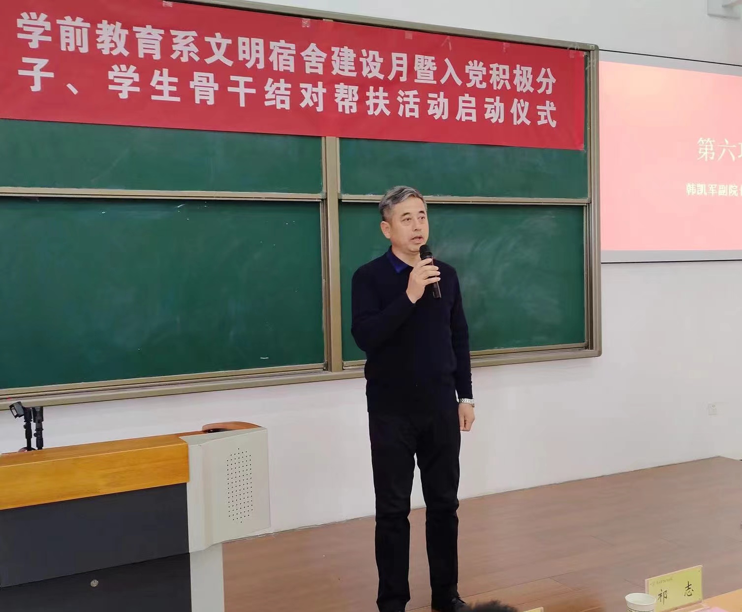 12月1日,学前教育系在长安校区举行“文明宿舍”建设月暨入党积极分子、学生骨干结对帮扶活动启动仪式。副院长韩凯军出席并讲话,学生工作部(学生处)部(处)长祁志,工会副主席潘小燕,图书馆副馆长刘延民,学前教育系党总支书记、副主任刘延隆,资产财务处副处长雷虎峰,学前教育系学生工作负责人卜建丽,以及学前教育系全体辅导员、班主任,2022级入党积极分子、学生骨干,2023级宿舍长参加了启动仪式。启动仪式由辅导员朱羽菲主持。