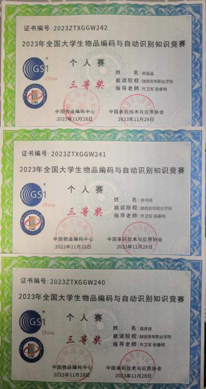 近日,2023年全国大学生物品编码与自动识别知识竞赛举行,交通运营服务系2022级现代物流管理专业学生廖书妍、廖晶晶、周彦佳同学分获个人三等奖。