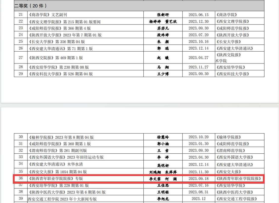 陕西高校新闻奖是由陕西省高校校报研究会组织评选,每年评选一次,评选范围涵盖消息、通讯、言论、新闻图片、新闻专栏、版面等六大类。2023年全省高校共有368件作品获奖,其中特等奖76件、一等奖111件、二等奖181件。