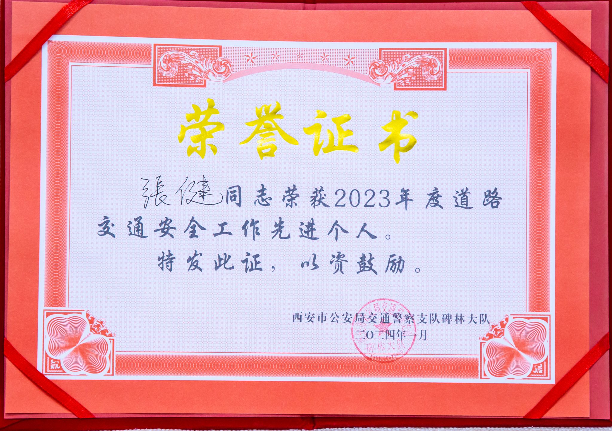 近日,西安市公安局交通警察支队碑林大队印发《关于2023年度交通安全先进单位及个人的表彰决定》,我院获评2023年度交通安全先进单位,张健同志荣获“先进个人”称号。