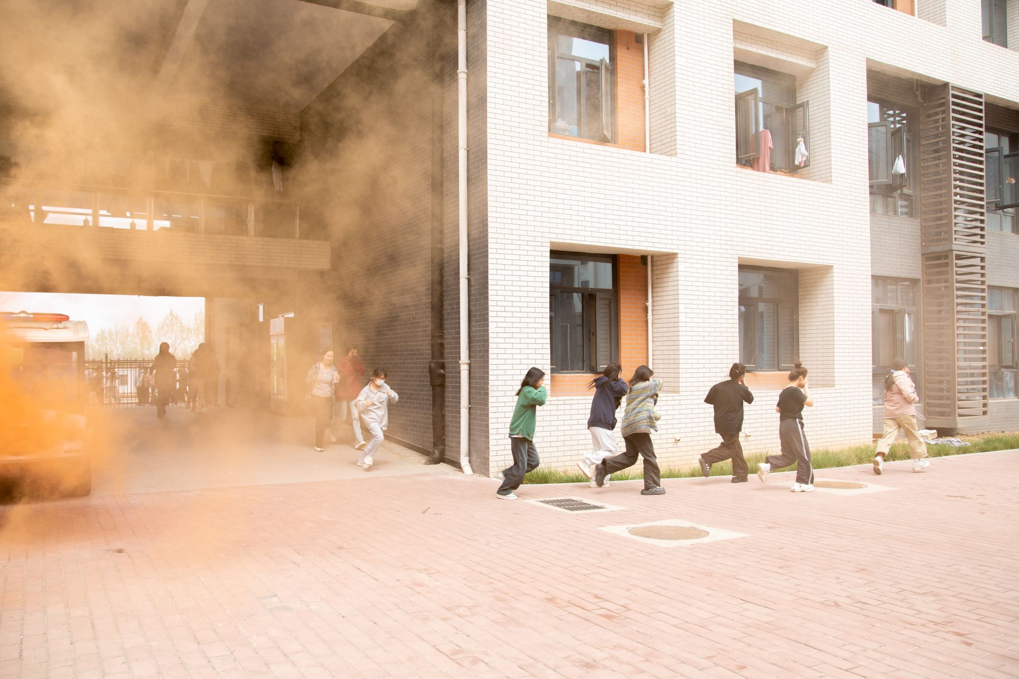 下午13:00点,各参演单位人员就位,韩凯军宣布:“taptap点点体育2024年春季火灾疏散逃生演练现在开始”。安保人员点燃烟雾弹模拟火情,公寓区火灾警报响起,广播循环播放疏散提醒,公寓管理员收到火灾警报后迅速将17号公寓一楼所有安全疏散出口打开。17号公寓学生用湿毛巾捂住口鼻,低头弯腰,在各楼层辅导员层长的组织引导下按照预定的疏散路线有序疏散逃生至操场,按楼层迅速集合,清点人数,按照“舍长-层长-楼长”顺序汇总疏散人数,17号公寓楼楼长向学生处报告楼内应疏散人数和实际安全疏散人数。