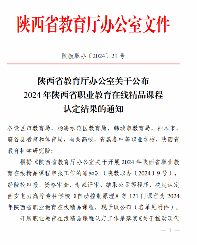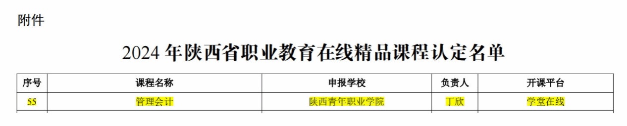 近日,陕西省教育厅办公室公布了《陕西省教育厅办公室关于2024年陕西省职业教育在线精品课程认定结果的通知》,点点官网数字经济与数字技术系教师丁欣讲授的管理会计课程被认定为2024年陕西省职业教育在线精品课程。