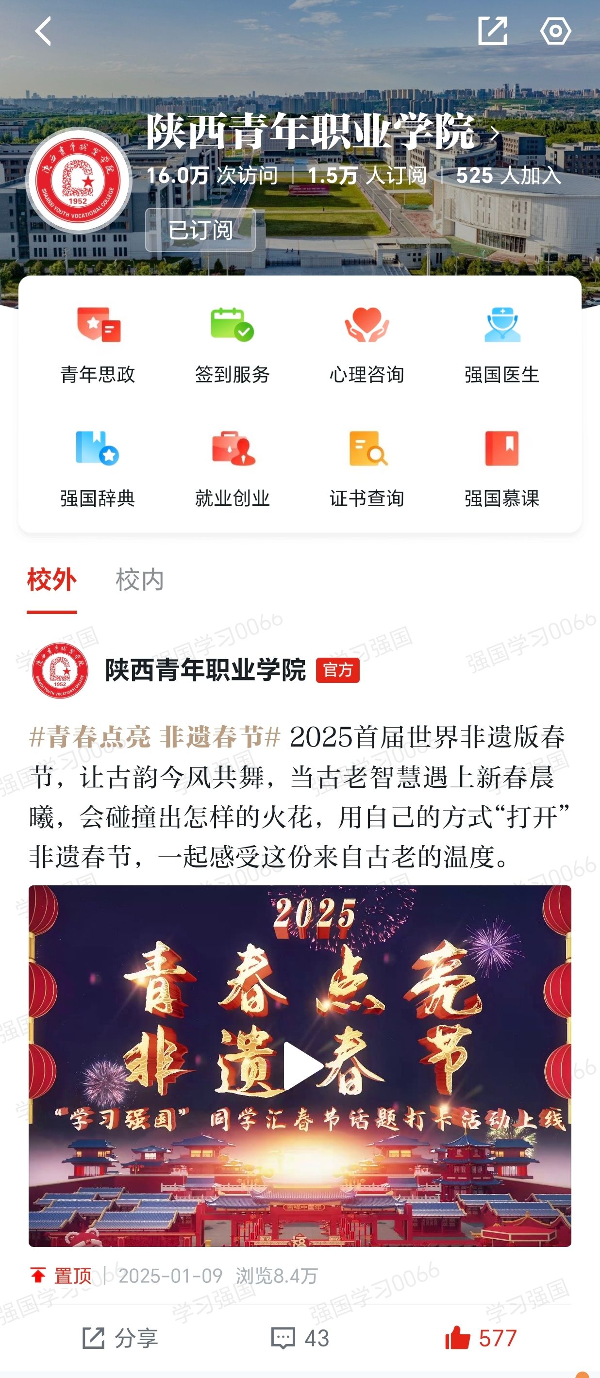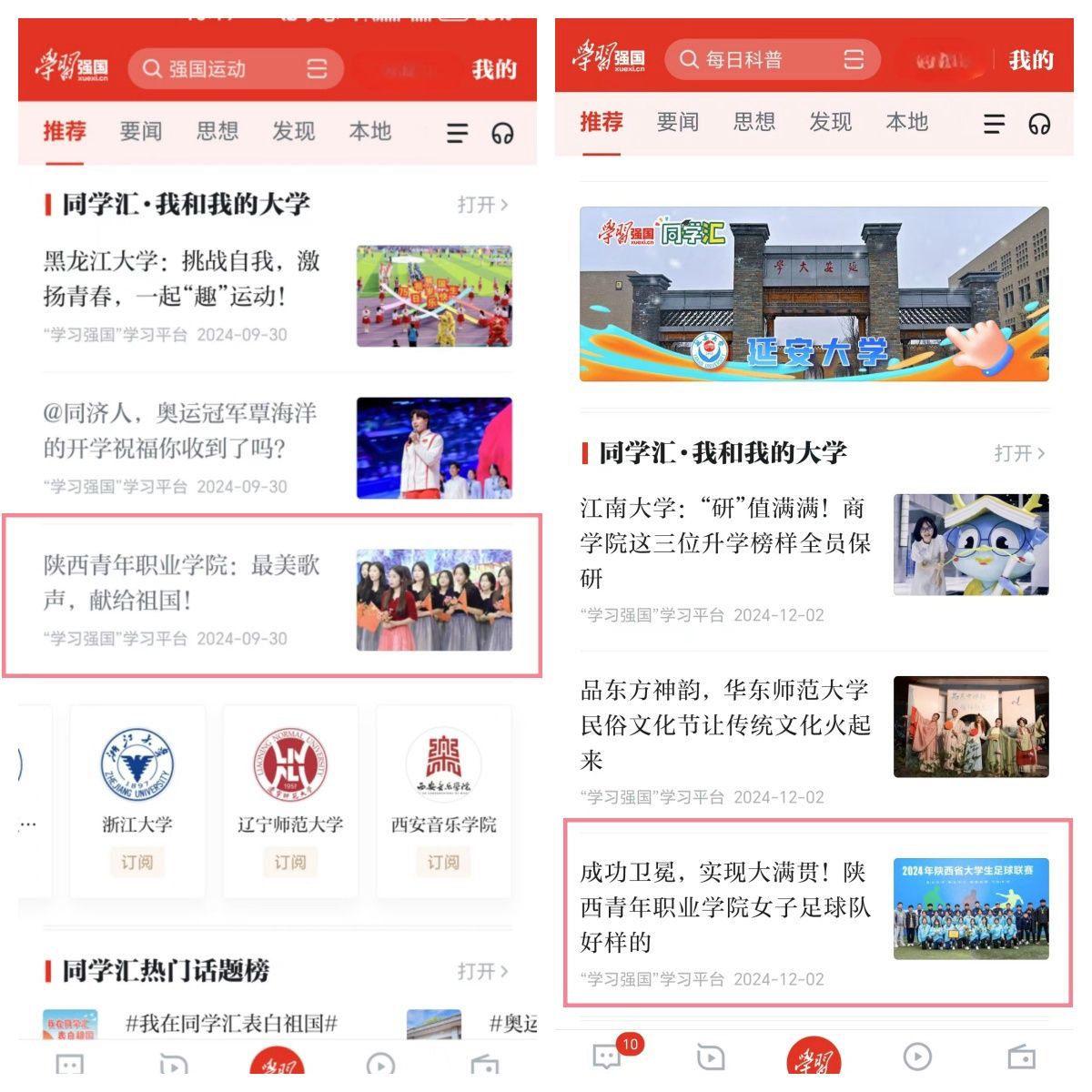 点点官网自2023年9月开通“学习强国”同学汇以来,安排专人负责运营和维护平台,围绕党建思政、人才培养、教育教学、校园文化等方面积极创作、发布各类图文、短视频等作品,2023年度曾获同学汇人气作品奖一项。截止2025年1月,点点官网同学汇首页访问量达16万,1.5万人订阅,2024年共6次荣登同学汇全国高校排行榜单前50名,7次荣登人气作品榜单全国高校前100名,13次被学习强国同学汇首页推荐,进一步扩大了学校的美誉度和影响力。