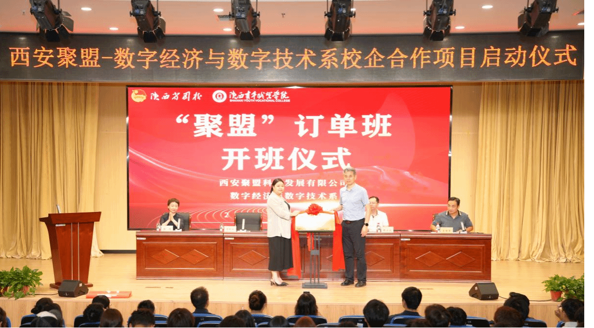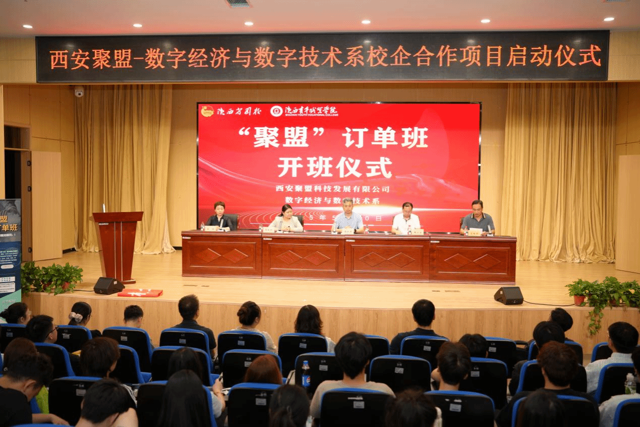 5月20日,数字经济与数字技术系与西安聚盟科技发展有限公司合作的“聚盟订单班”开班仪式在长安校区报告厅举行。副校长韩凯军、聚盟高级运营经理周权利、聚盟中国区招聘总监侯婷、教务处处长张小卫、数字经济与数字技术系党总支书记副主任庄绪强、省级教学名师王晓生、大数据技术专业群教师和学生参会,仪式由庄绪强主持。