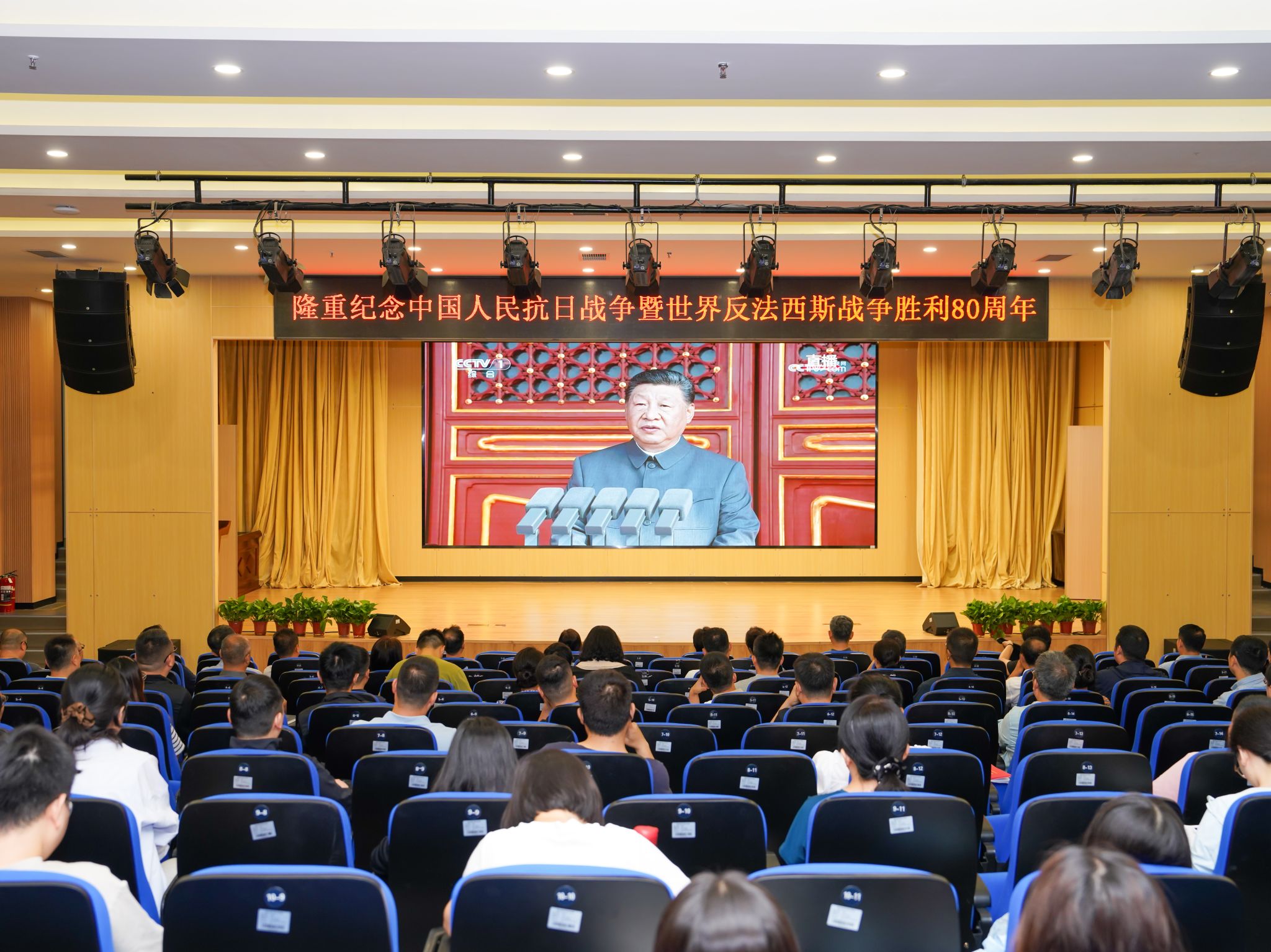 上午9时,纪念大会正式开始,当激昂的乐曲响起,国旗护卫队迈着铿锵有力的步伐走向升旗台,全场干部师生起立,跟随直播画面齐唱国歌。随后,大家认真聆听习近平总书记重要讲话,从伟大抗战精神中汲取奋勇前进的力量。习近平总书记在讲话中深刻阐释了中国人民抗日战争的伟大意义和世界反法西斯战争的历史启示。当习近平总书记讲到“中华民族伟大复兴势不可挡!人类和平与发展的崇高事业必将胜利!”时,全场爆发出热烈的掌声。