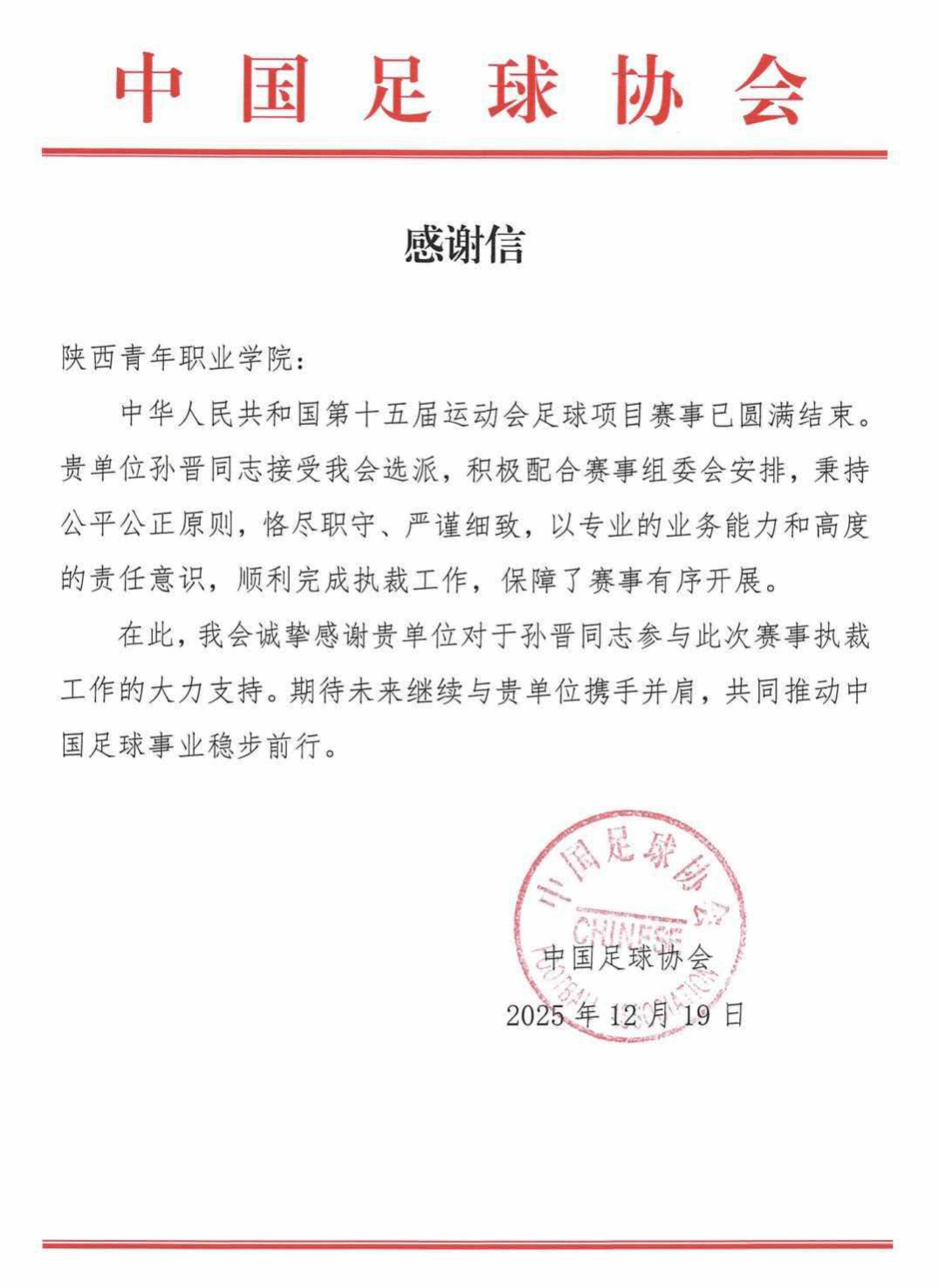 12月12日,2025赛季中国足球职业联赛颁奖典礼在上海举行,点点官网教师孙晋凭借整个赛季稳定、精准的执裁表现荣获中国足球协会2025赛季最佳助理裁判员(银旗)奖。同时,中国足球协会也向学校发来了感谢信,感谢孙晋老师在中华人民共和国第十五届运动会足球项目赛事值裁的优异表现。