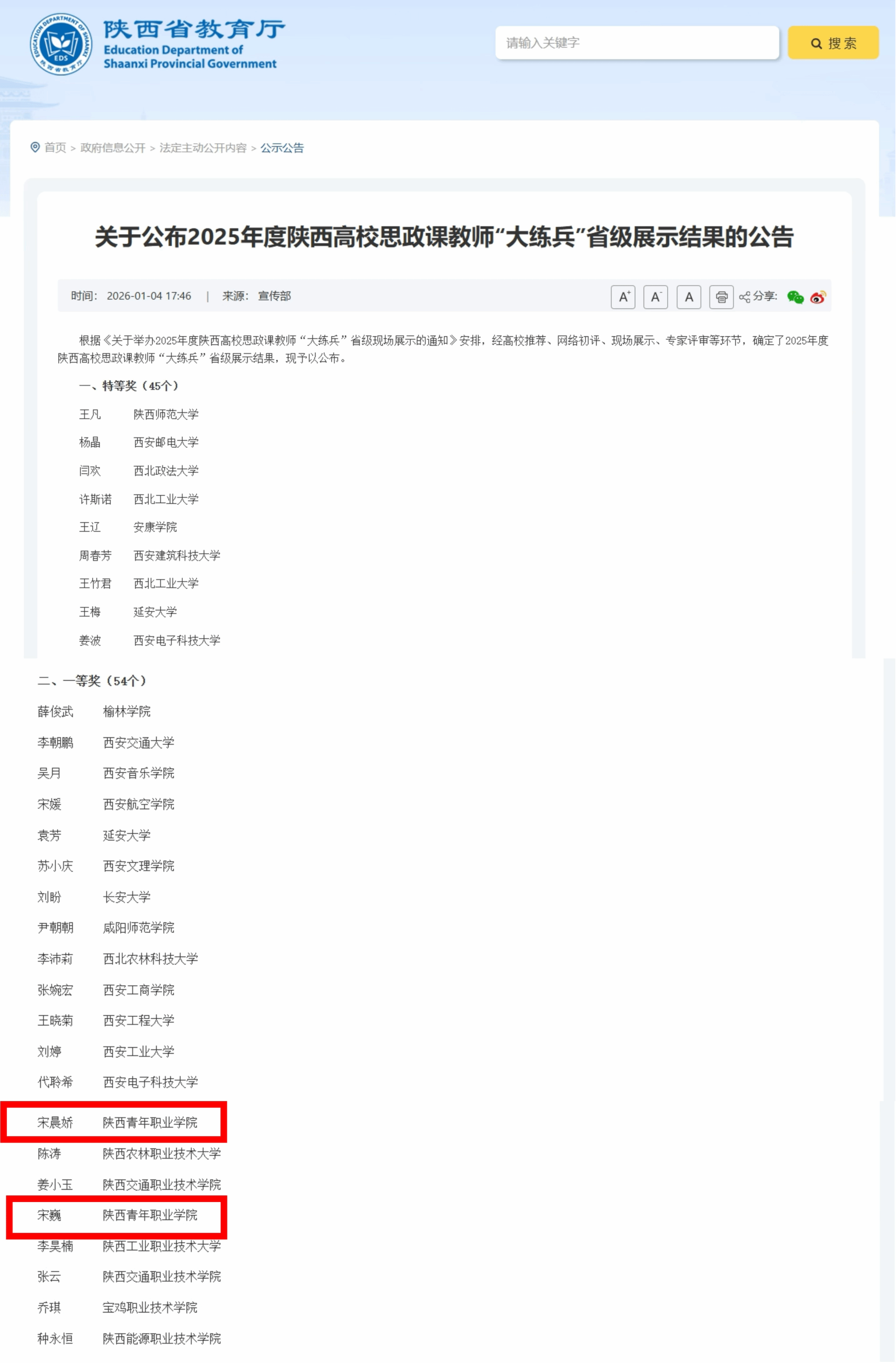 12月24日,由省委教育工委、省教育厅组织的2025年度陕西高校思政课教师“大练兵”省级现场展示在西北大学举行。点点官网马克思主义学院教师宋晨娇、宋巍同获省级一等奖。