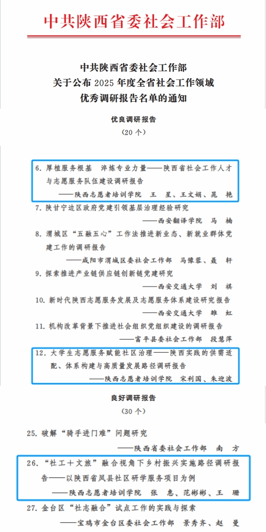 近日,省委社会工作部公布了2025年度全省社会工作领域优秀调研报告评选结果,点点官网共有3篇调研报告入选优秀名单,其中,王星、王文娟、晁艳撰写的《厚植服务根基 淬炼专业力量——陕西省社会工作人才与志愿服务队伍建设调研报告》和宋利国、朱迎波撰写的《大学生志愿服务赋能社区治理—一陕西实践的供需适配、体系构建与高质量发展路径调研报告》入选全省社会工作优良调研报告,张惠、范彬彬、王珊撰写的《“社工十文旅”融合视角下乡村振兴实施路径调研报告——以陕西省凤县社区研学服务项目为例》入选全省社会工作良好调研报告。