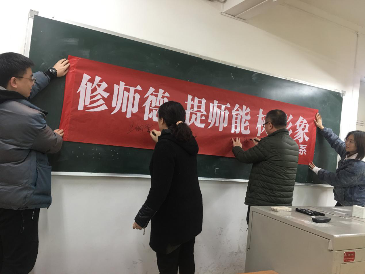为进一步加强师德师风建设,争做“人民满意的教师”,做学生健康成长的引路人,管理系教学副主任邵华带领全系教职工重温学习了教育部《高等学校教师职业道德规范》和《新时代高校教师职业行为十项准则》,并集体进行了“修师德、提师能、树形象”横幅签名活动。韩洲雄结合习近平总书记有关讲话精神和近期院系工作实际,进一步强调了师德师风建设的重要性、内容要求和形式体现等,要求全系教职工从自身做起,以实际行动践行教师职业道德规范。