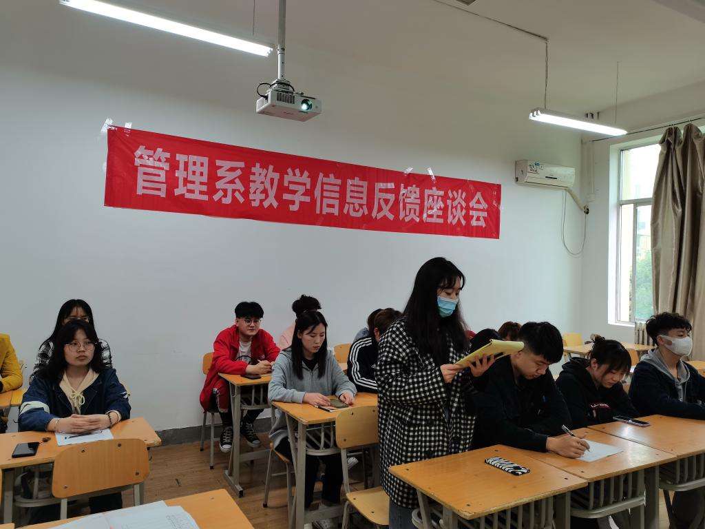 4月25日下午,管理系在雁塔校区召开本学期教学信息反馈座谈会。会议由管理系负责人韩洲雄主持,各教研室主任齐卫军、郑涛、范彬彬、王伟宏,系教学秘书杨淼、创新创业实验班、2019级及2020级各班教学信息员等20余人参加了本次会议。