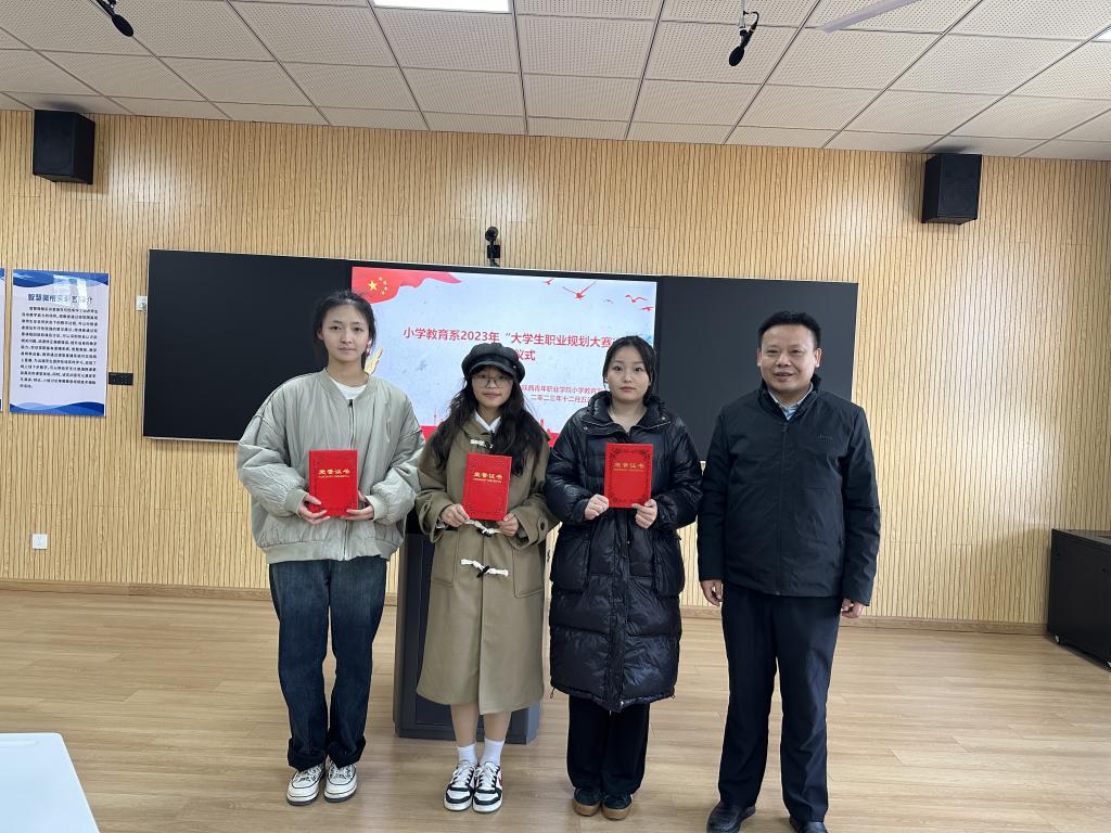 颁奖仪式上,高鹏宣读了《小学教育系关于表彰大学生职业规划大赛获奖个人的决定》,并为获得一、二、三等奖、优秀奖的选手和优秀指导教师颁奖。