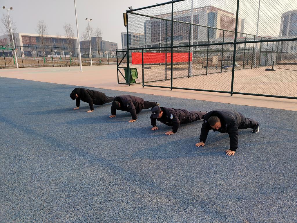 本次考试包括理论笔试和体能测试两个环节。理论笔试主要考察队员的政治思想教育、职业道德、法律法规、保安业务常识。体能测试依次考核4*10米往返跑、俯卧撑、跳绳等项目。