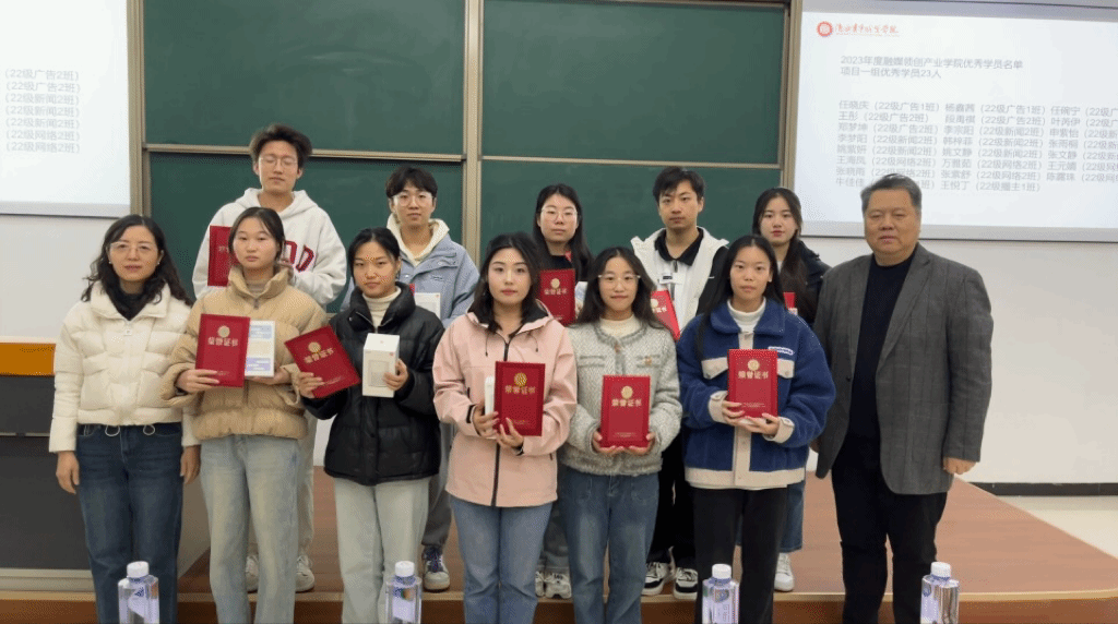 李卓首先介绍了融媒体领创产业学院2023年开展的主要工作,对优秀学员作品进行了集中展示,2023年共有23名学员的33副摄影作品、7名学员的“二十四节气”海报作品,在移动电视频道“出行路上的发现与分享”栏目、西安市公交车大屏、校园屏上刊载。与会领导嘉宾为优秀学员颁发了证书和奖品。优秀学员代表、2022级广告艺术设计专业2班学生叶芮伊发言,她分享了自己加入融媒领创产业学院以来的收获、感想,她建议更多的大一同学加入融媒领创产业学院,在更广阔的舞台上展示专业风采。高艺麟介绍了陕西广电融媒体集团移动电视频道下设栏目,并对投稿规格进行了说明。
