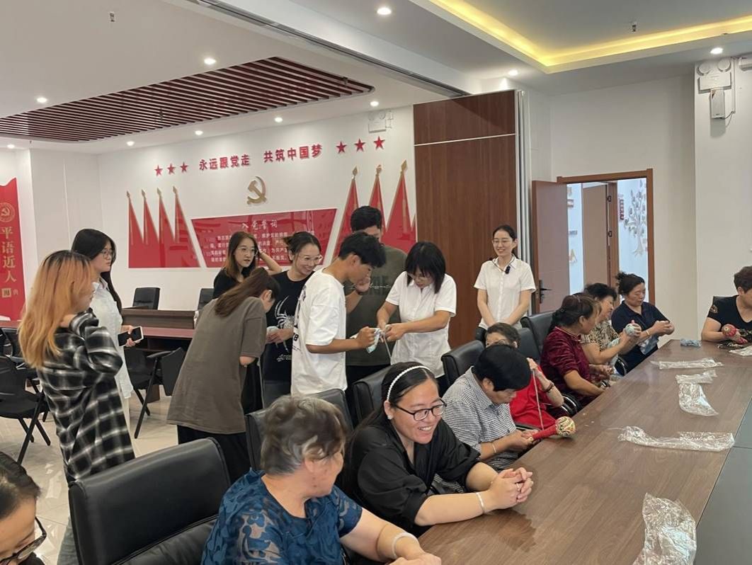 在本次参观过程中,恰逢老年人制作“艾草锤”活动,同学们纷纷加入其中,帮助他们共同完成任务,活动现场气氛轻松活跃。