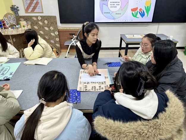 活动中,青年教师马馨蕊以“幼儿园社会领域活动设计”课程中幼儿园项目化活动推进的“探究循环到设计循环过渡”为教学内容,以“秦腔”特色传统文化为切入口,引导学生理解不同年龄段幼儿的发展特点,掌握循环过渡的逻辑,重点阐释了“建模引导幼儿设计反思”的方法。
