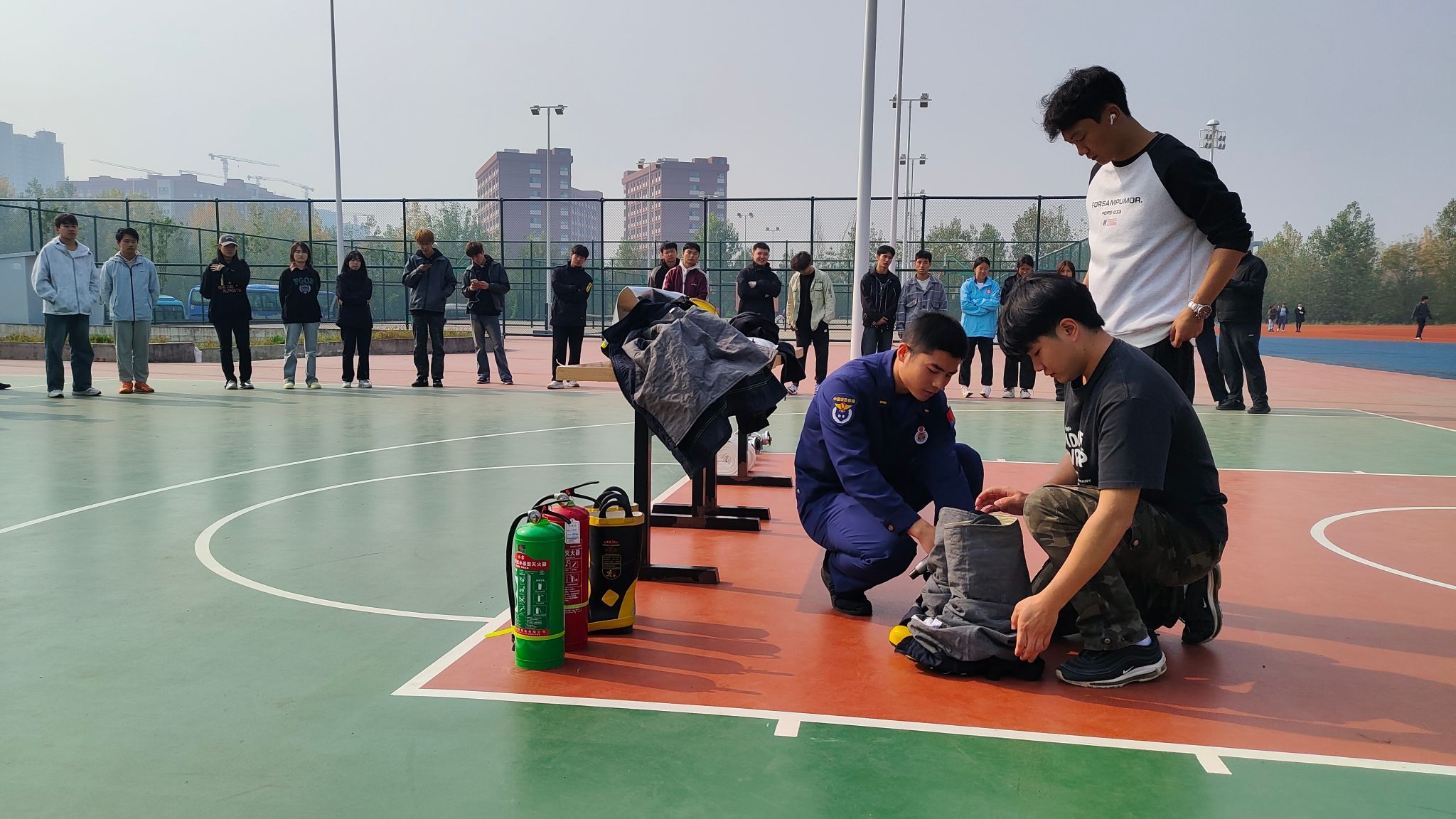 为了确保培训效果,培训邀请长安区南长安街消防救援站张付康班长进行宣讲。他结合校园消防工作实际,用通俗易懂、生动形象的语言为大家详细讲述了消防安全基本常识,重点对灭火器使用、防毒面具使用方法、防火服的穿戴、消防水带的连接等进行了讲解和示范。张付康通过“互动式”讲解,与现场学生共同一起动手操作,让大家在听、看、练中学习消防知识和掌握消防设备使用方法,赢得了同学们热烈的掌声。