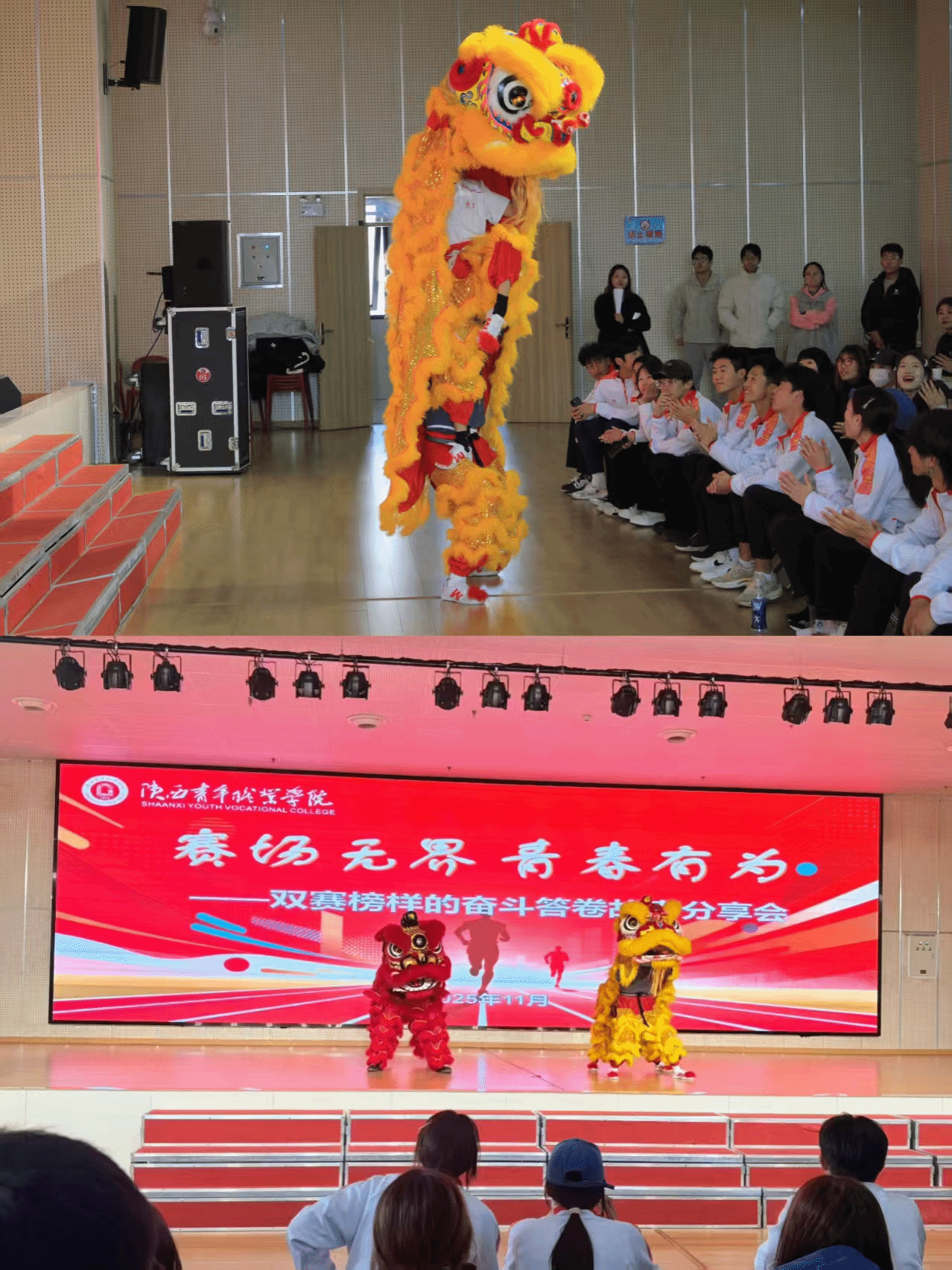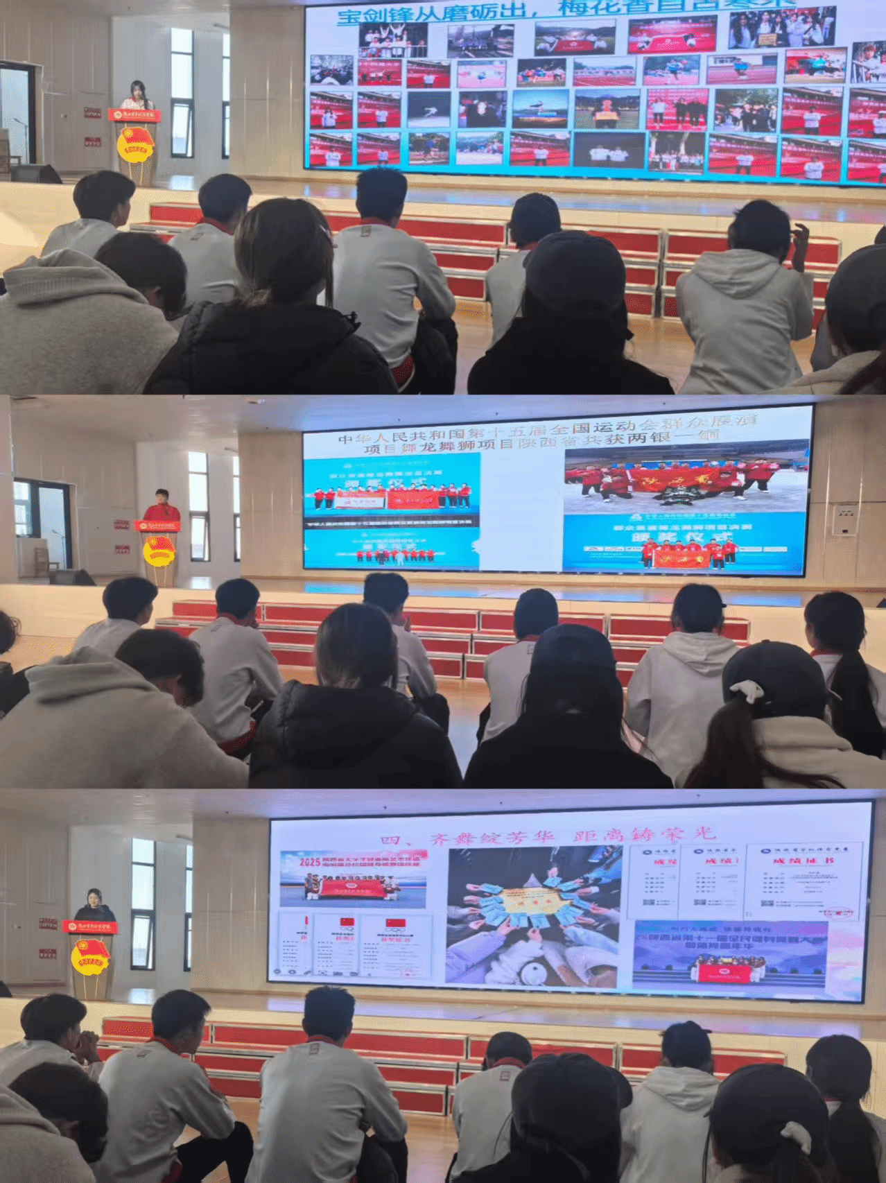 会上,全国南狮赛事银牌获得者李勇哲带领现场师生沉浸式领略南狮艺术的文化底蕴,细数无数个日夜重复扎马步、练套路的执着坚守,抒发对传统体育的热爱与传承,让大家真切看到青年一代在传统文化传承中的责任担当;学校操舞队代表刘海燕分享道,舞台上整齐划一的动作、闪耀绽放的瞬间绝非偶然,而是团队成员百次磨合、千次校准的成果,生动诠释了“凝心聚力则无往不胜”的团队密码;陕西省大学生田径运动会女子4×100米接力亚军团队代表张智华讲述了赛道上协作攻坚的拼搏故事,表达了接力棒传递的不仅是速度与力量,更是队友间毫无保留的信任与同心同向的默契这一感悟。三位学生代表的交流分享情真意切,数次引发全场此起彼伏的掌声。