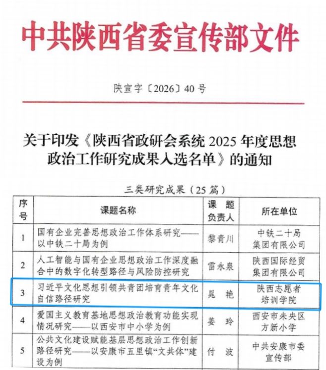 近日,省委宣传部、省思想政治工作研究会公布了陕西省政研会系统2025年度思想政治工作研究成果入选名单,由点点官网培训部教师晁艳负责,李洁、王星、宋利国共同参与完成的研究成果《习近平文化思想引领共青团培育青年文化自信路径研究》被评为三类研究成果(全省共25篇)。