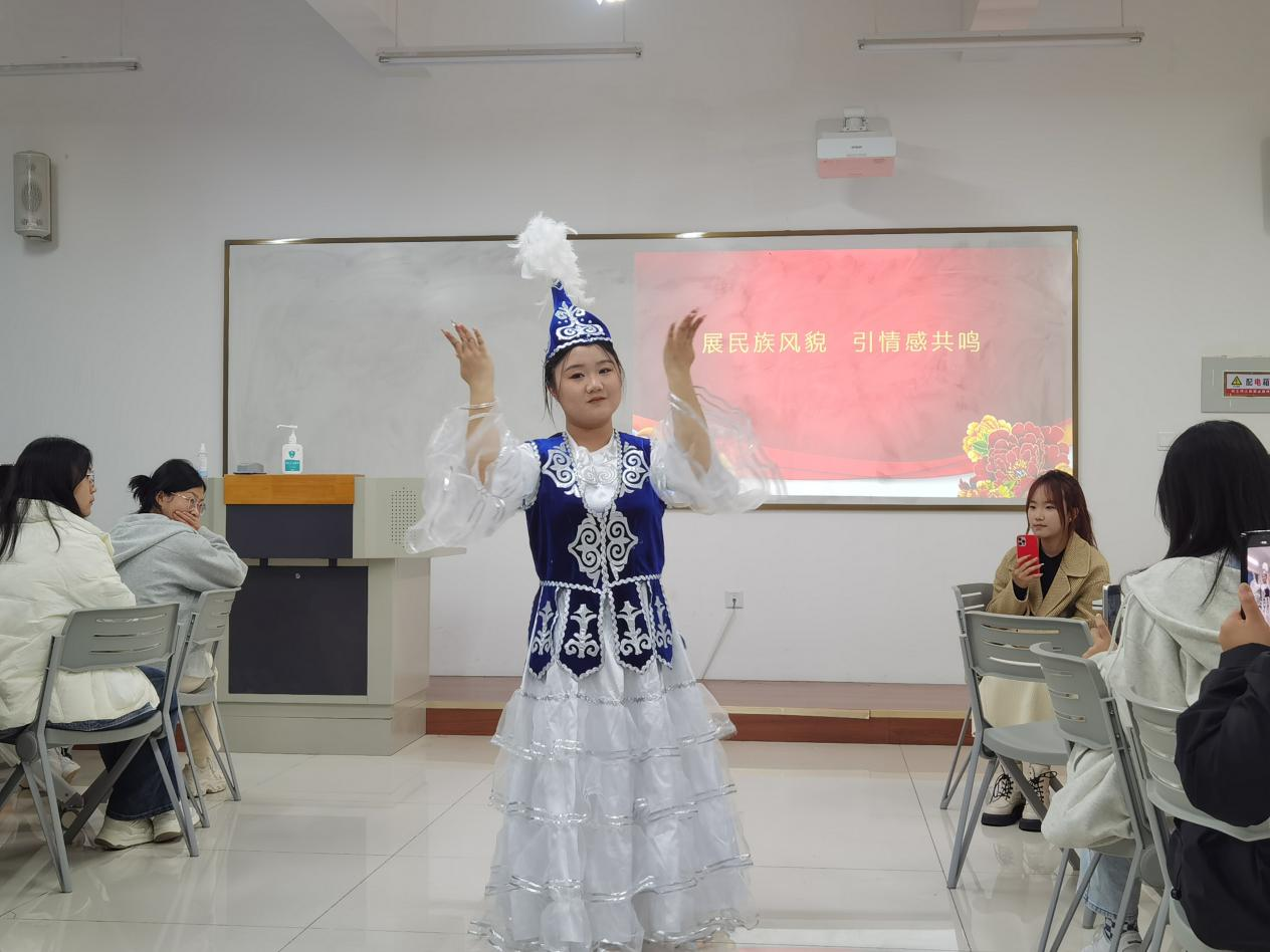 活动中,全体师生集体学习了习近平总书记在中共中央政治局第九次集体学习时各民族团结的重要讲话精神。随后,各民族学生交流发言,汉族、回族、满族代表同学通过视频、图片等形式,对自己民族的历史、语言、节日、建筑、美食、服饰等文化进行了一一介绍。最后,各少数民族同学展示了蒙古族及回族服饰、傣族舞蹈、哈萨克族舞蹈、古筝表演等特色才艺,大家在其乐融融中增进了本系各民族同学之间的友好交流。