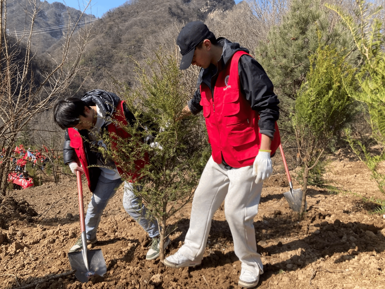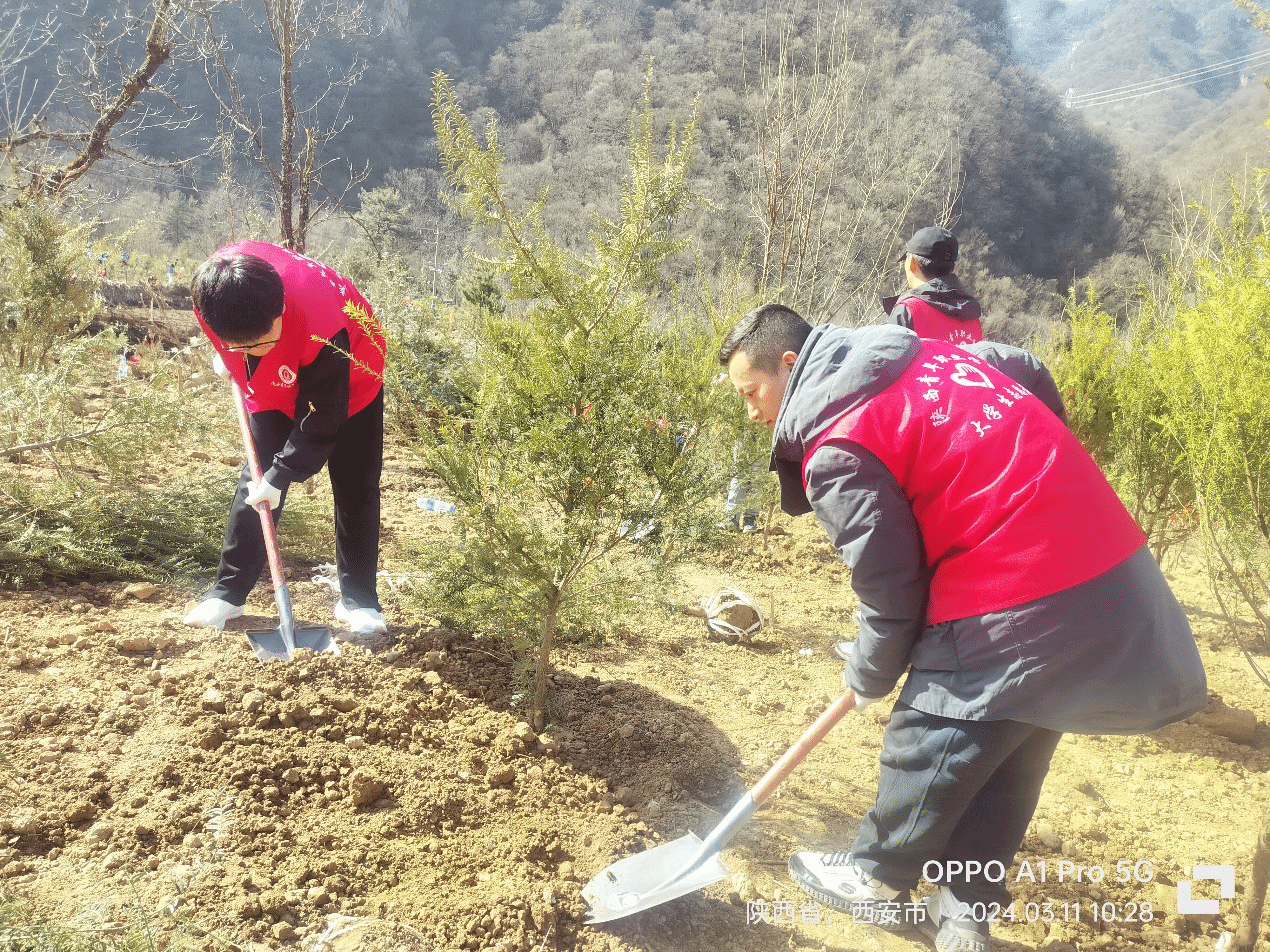 活动中,我院志愿者们来到西安市鄠邑区景区管理局涝峪营盘沟植树点参加义务植树活动。按照工作人员的指引,依次进行签到并领取树苗到指定区域参与植树。同学们每两人一组,严格按照标准挥锹铲土、扶苗填坑、提水浇灌,在田间地头来回穿梭、互帮互助,植树活动现场一派热火朝天的景象。