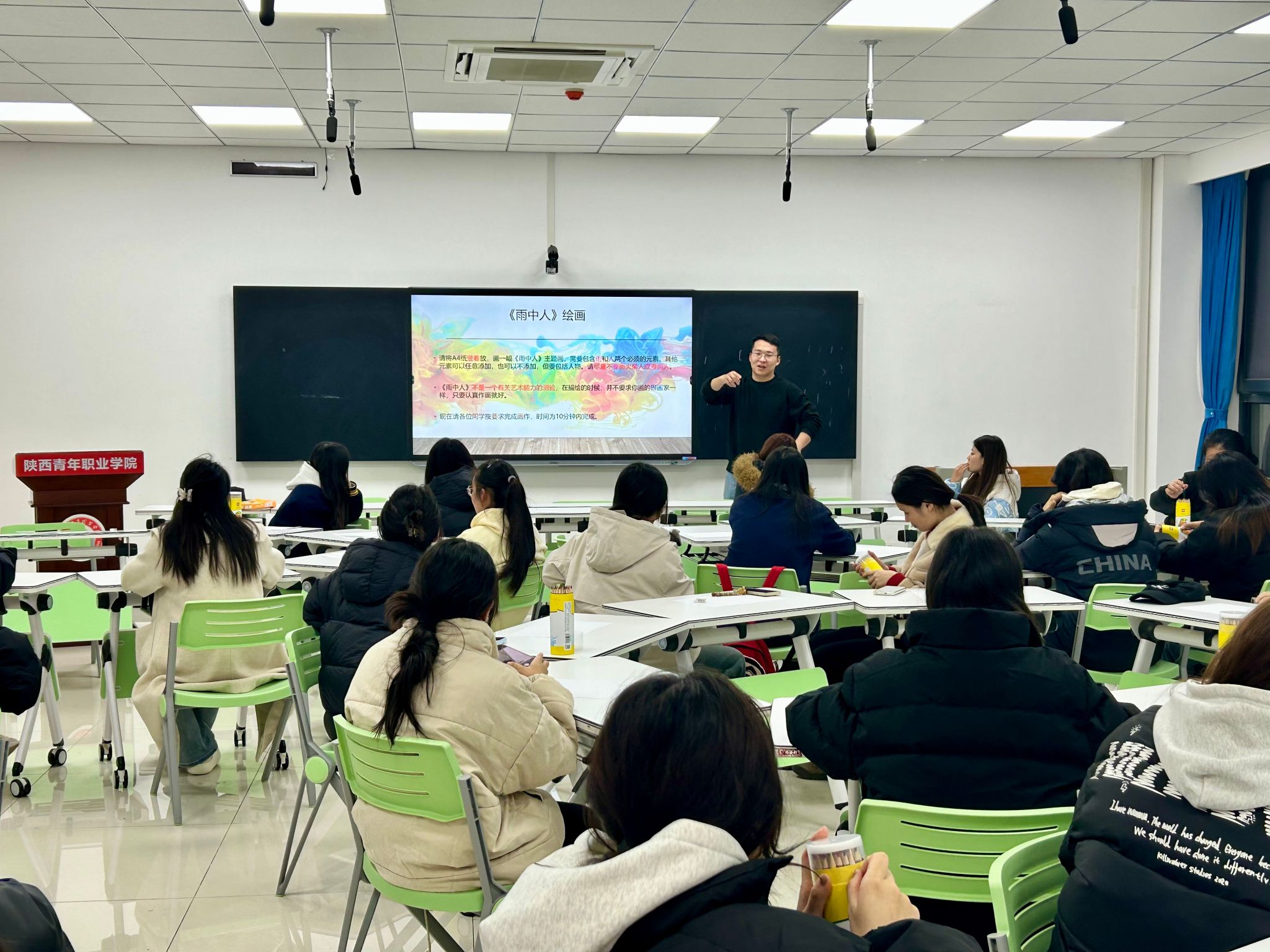 随后,在杜浩老师的引导下,同学们进行了“雨中人”绘画的创作。“雨中人”绘画疗愈是一种通过绘画来探索个体内心世界、情绪状态以及应对压力方式的心理治疗技术。杜老师对画作元素进行了解读与分析,比如雨滴稠密程度代表了压力的大小,遮雨物的不同代表了解决压力方式的不同,人物的大小代表自信程度,还有一些其他元素如是否有路灯、太阳等,都代表了绘画者不同的心境和对待压力时的态度以及处理方式等。杜老师与同学们现场进行了交流问答,帮助同学们从自己的作品中发现新的自我,现场气氛热烈、同学们兴致高涨。许多学生表示,通过绘画,他们不仅更加清晰地认识了自己的情绪状态,还意外地发现了自己未曾察觉的潜能与优势。